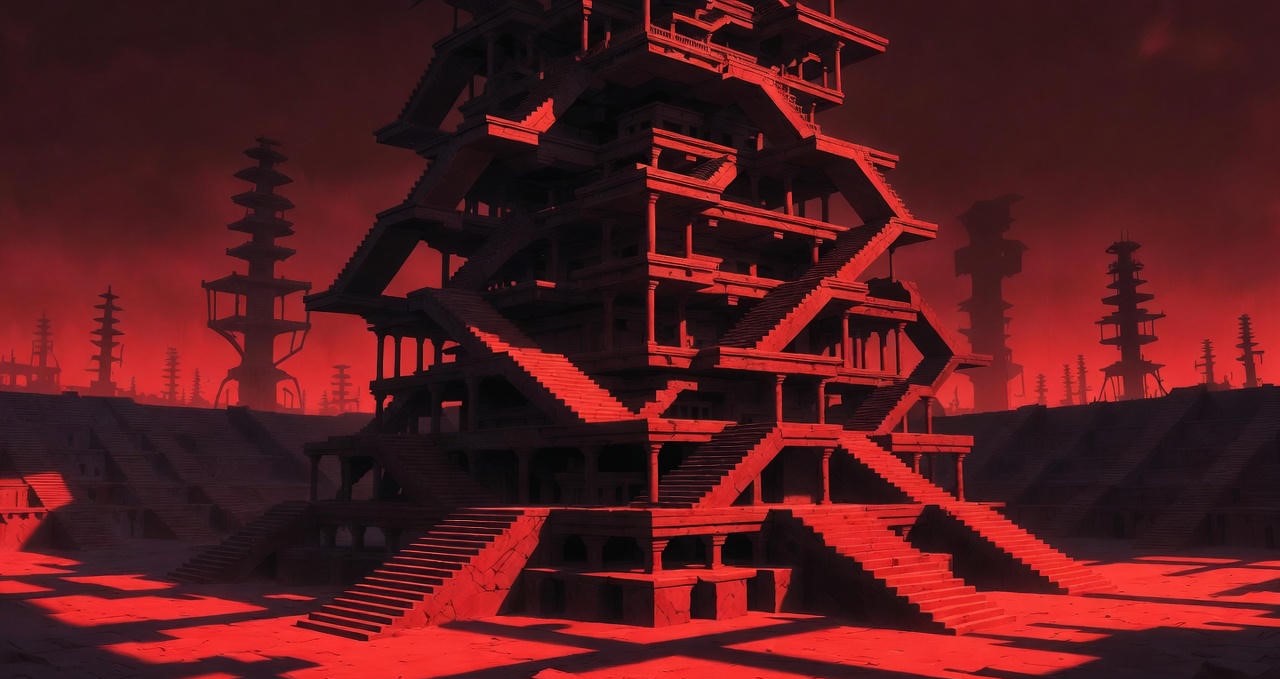 平均六層樓高的塔群,就像機械舞臺,是由齒輪、轉盤、燈具等混雜構建而成,冰冷的機具「子」塔作為外圍,而在中央則是一座由「階梯」砌成的「母」塔傲立破空。境內籠罩血光之中,持續擴大,所及則成新的「劇場」與「競技場」。